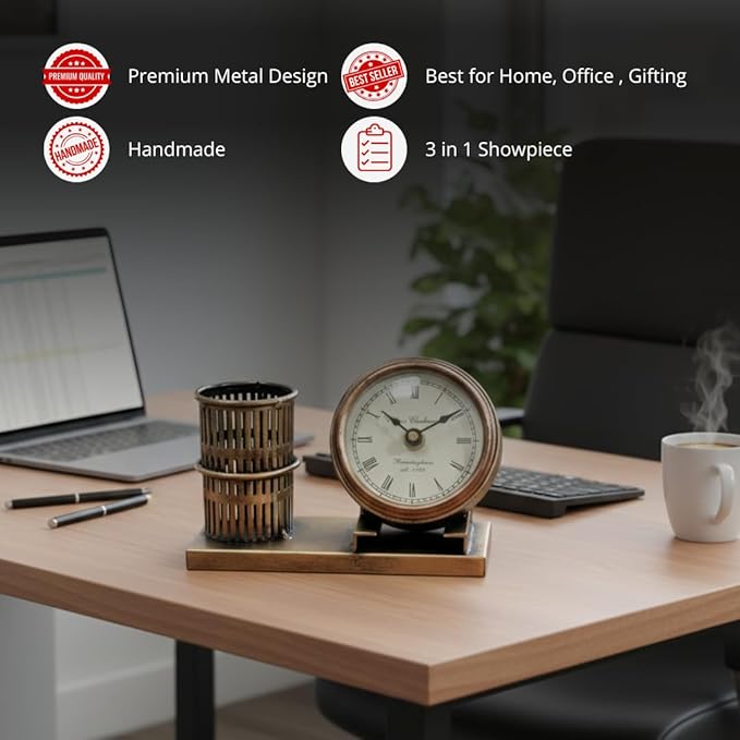 Metal Pen Stand | Table Clock | Card Holder – Vintage Desk Organizer. by KraftCaar